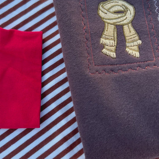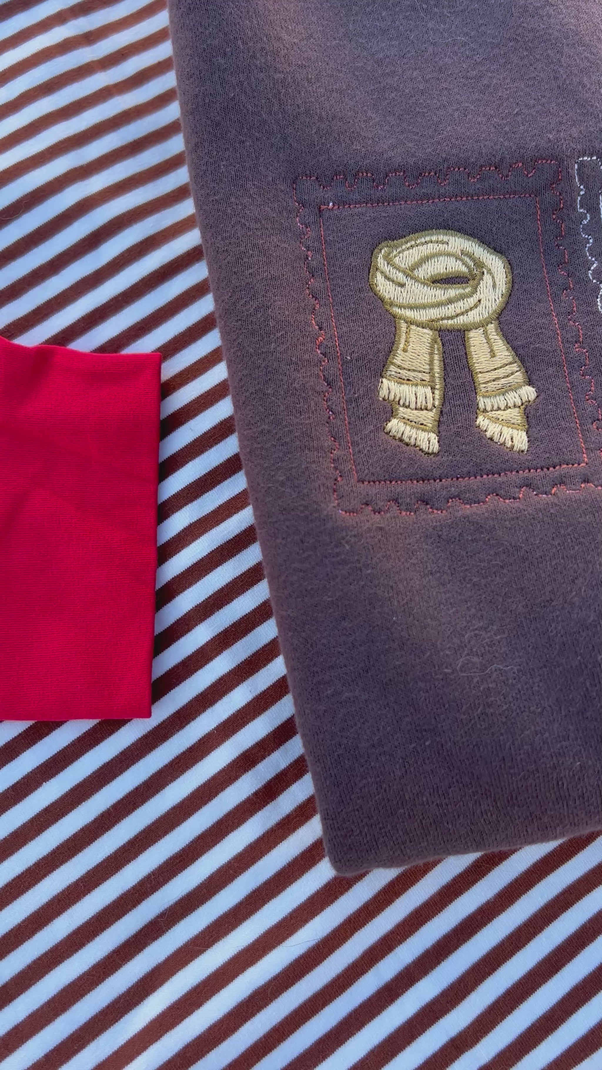 This design is embroidered on a 7.6oz 70/30 cotton-polyester crewneck sweatshirt in a chocolate brown color. The crewneck is fleece lined and has a relaxed fit. The crewneck is very soft and comfortable, perfect for the coziest of seasons.
