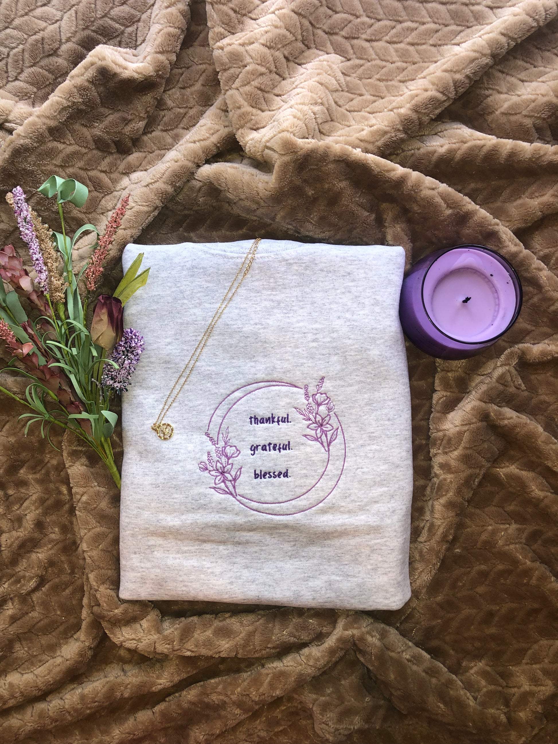 Design is embroidered on a Gildan crewneck that comes in this light gray/ash color. The crewnecks are unisex and run true to size, but if you prefer an oversized fit, we recommend sizing up 1-2 sizes. Size chart can be found here.