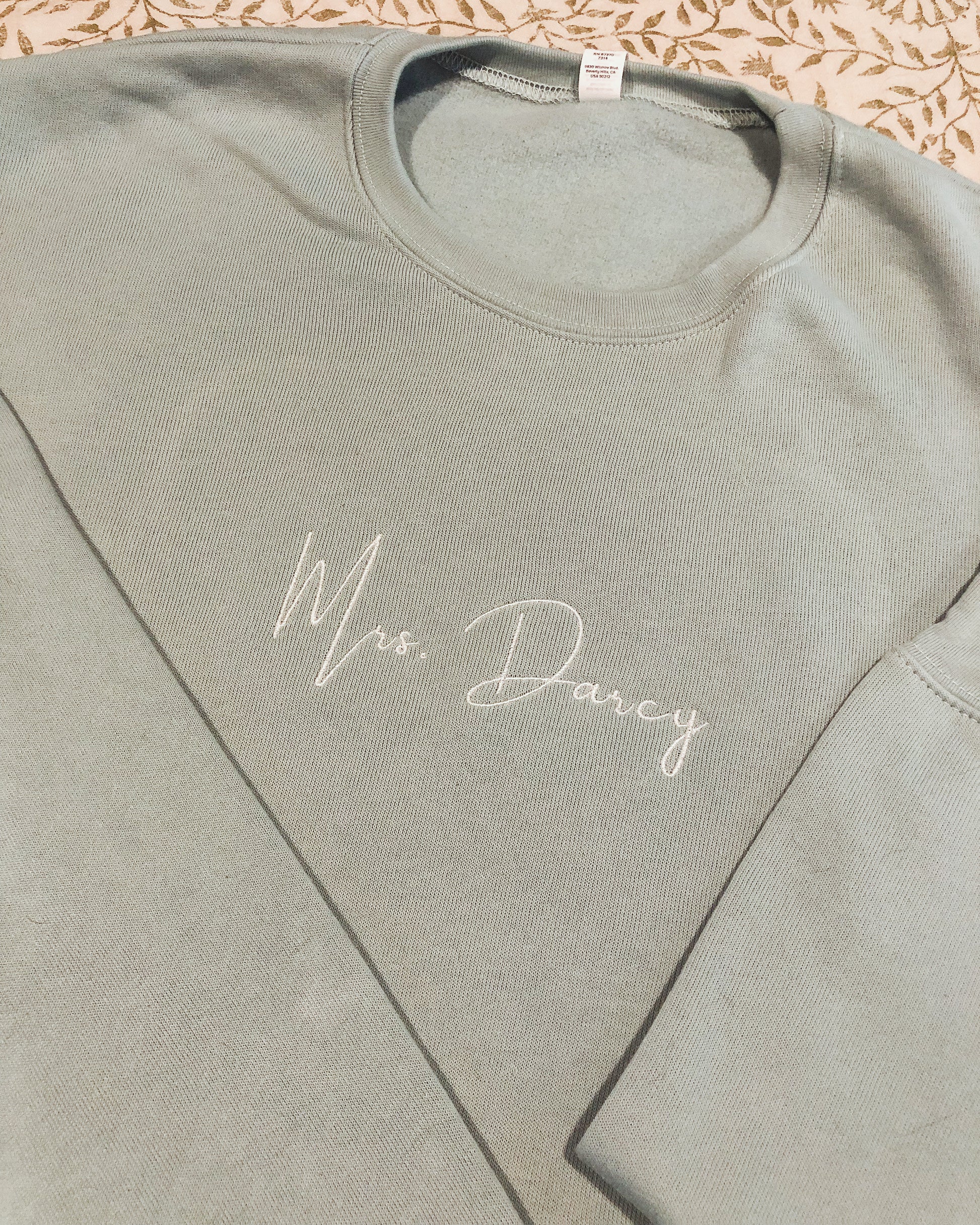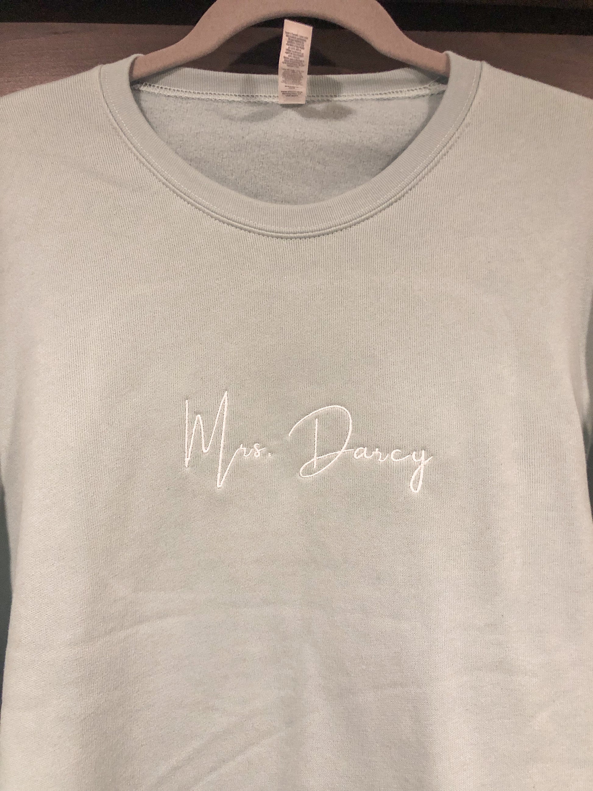 Design is embroidered on a Bella + Canvas crewneck that comes in this light teal color called dusty blue. This has a drop shoulder design and probably one of the softest fabrics I have placed on my body. The crewnecks are unisex and slightly oversized, but if you prefer a more oversized fit, we recommend sizing up 1 size. Size chart can be found here.