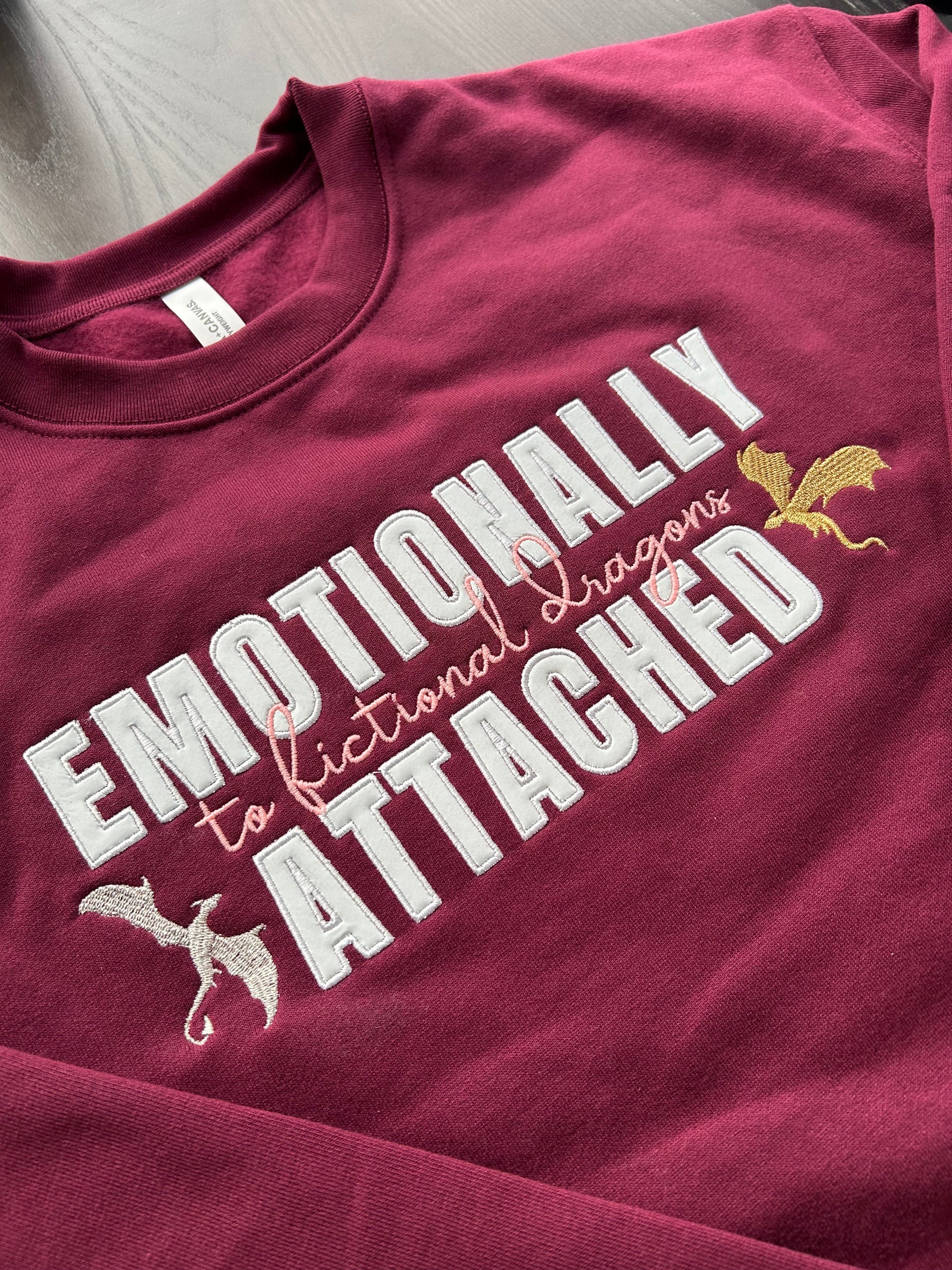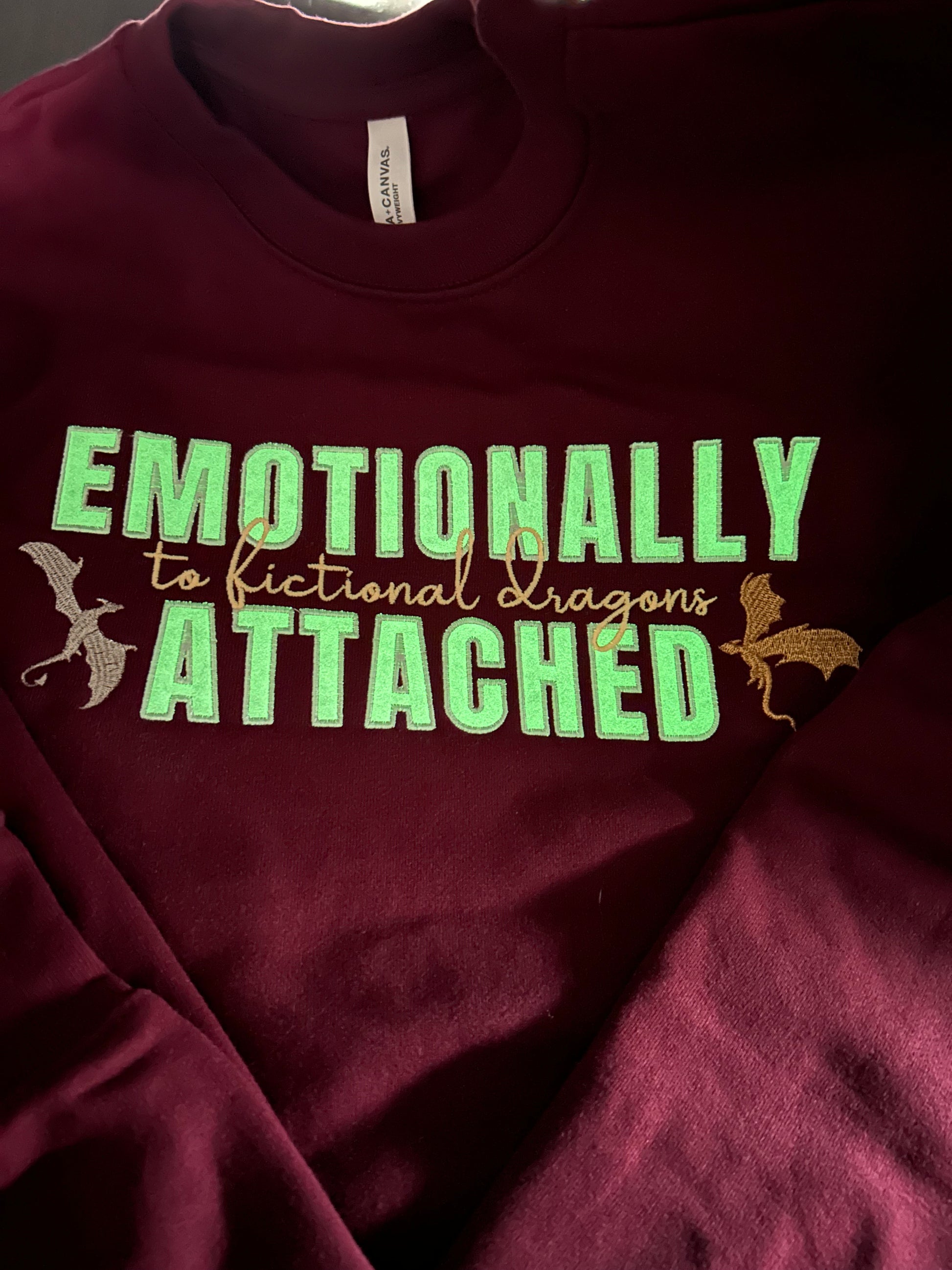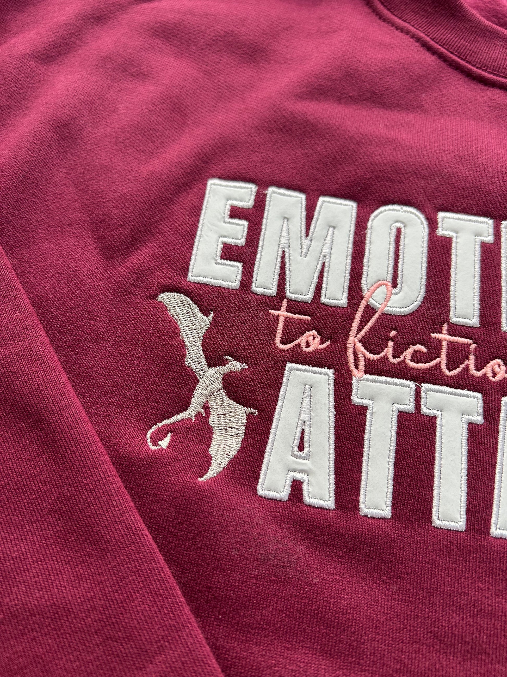 This appliqué design is embroidered on a 10oz heavyweight crewneck sweatshirt in the color maroon. The lettering in the design glows in the dark. The crewneck is fleece lined and has a drop shoulder effect and has a slightly oversized fit. The crewneck is very soft and comfortable, similar to the Pride & Prejudice Collection crewnecks.