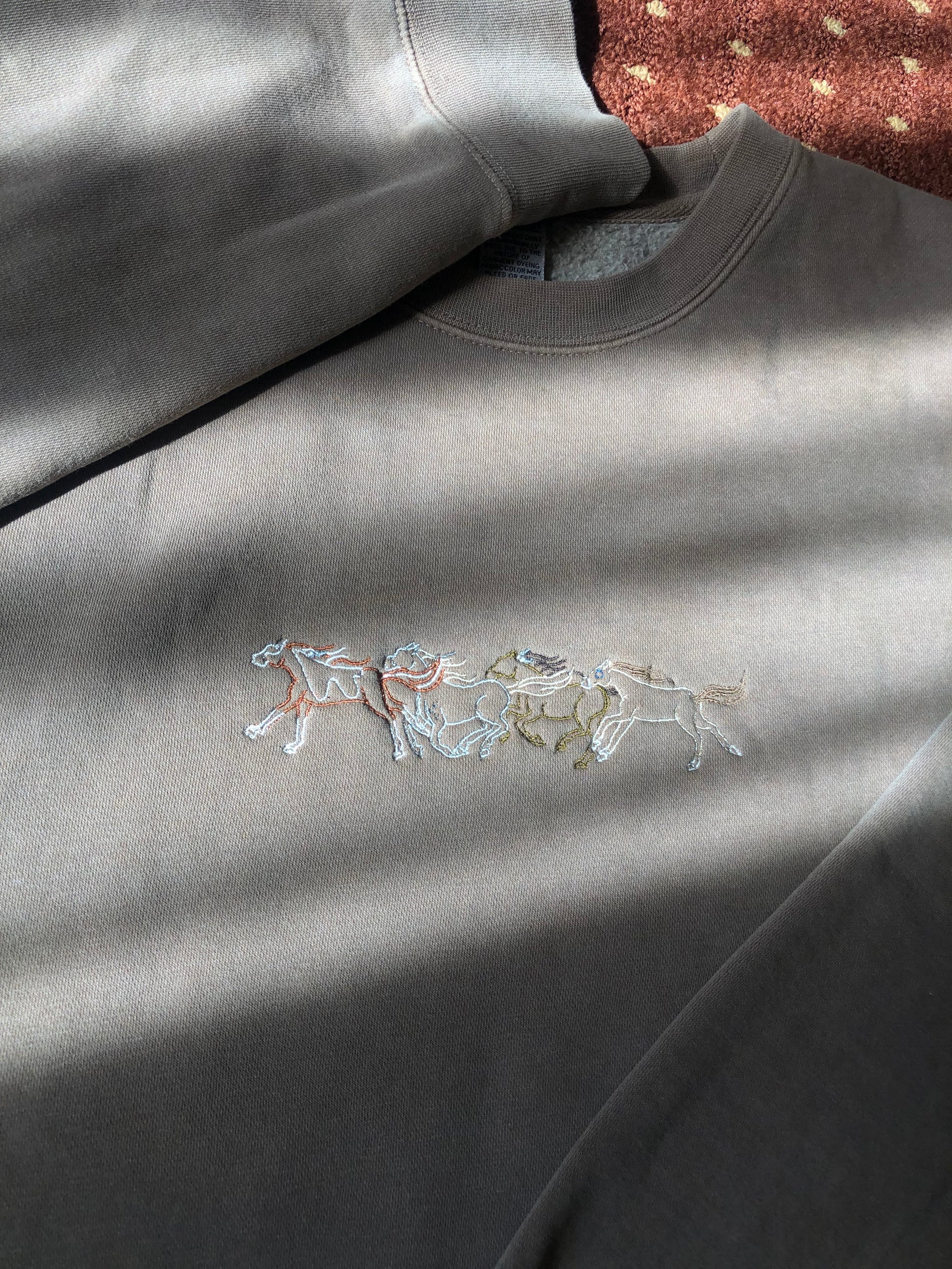 Design is embroidered on a Midweight Pigment Dyed crewneck on color clay. This Crew has individual and unique vintage character accomplished during a full garment dying process. Made with ultra soft cotton/polyester blend fleece in an assortment of amazing colors, these garments are as comfortable as they are eye catching. Premium ring-spun cotton is used to achieve a smooth and stable fabric surface for printing. Completed with a quality construction, and 1x1 ribbing at cuffs and waistband in a standard unisex fit.